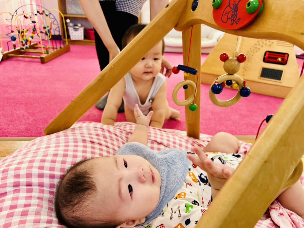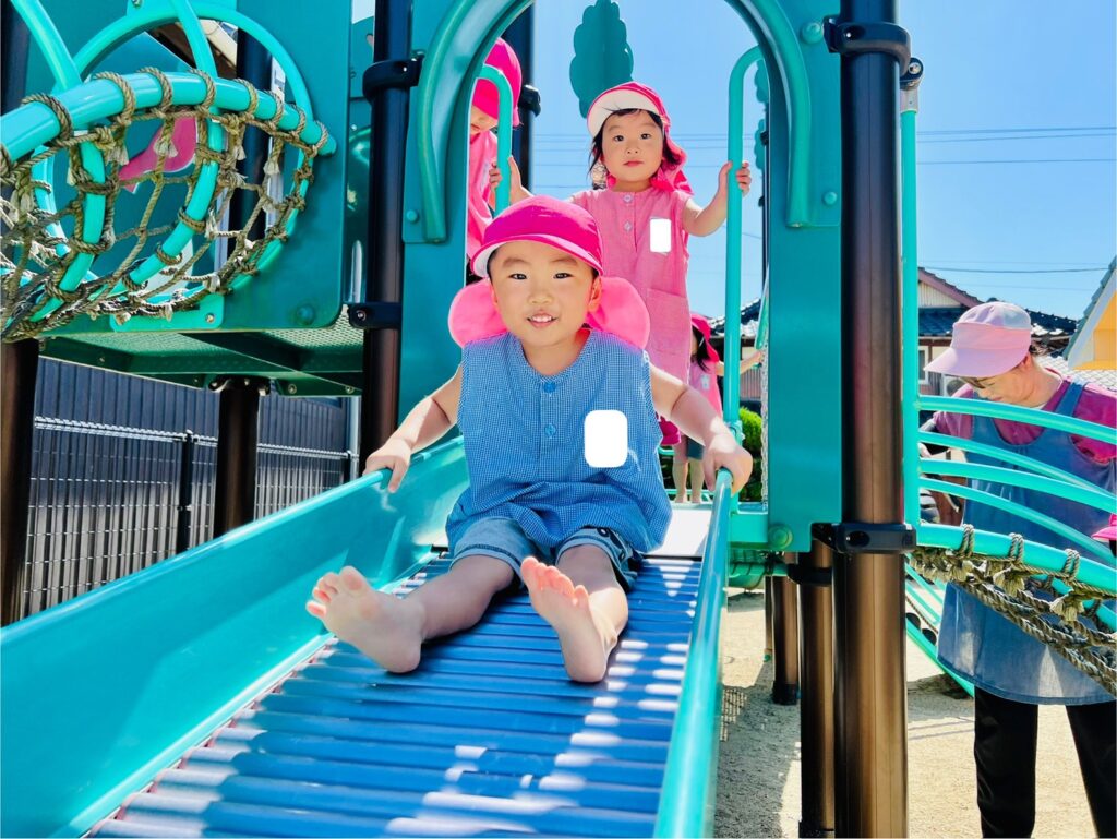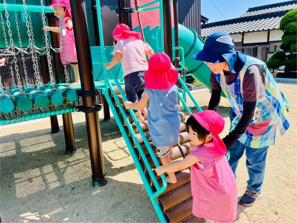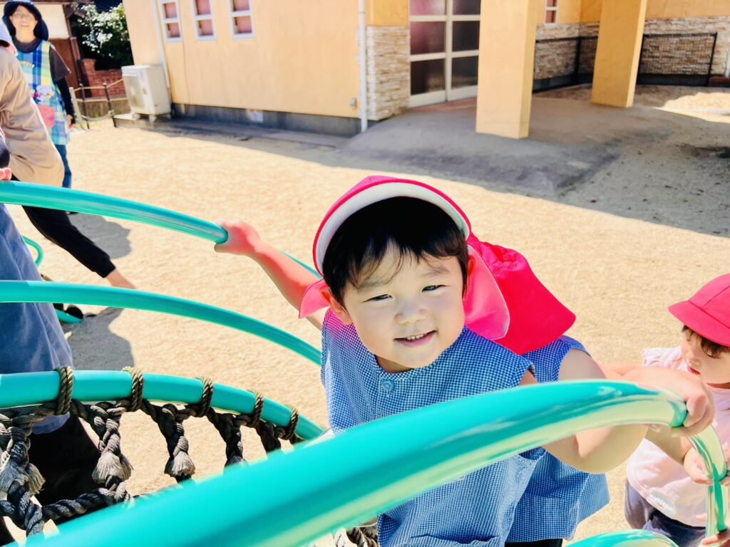 また2才児クラスのお友だちは、今日から〝憧れの総合遊具〟での遊びも始まりました。