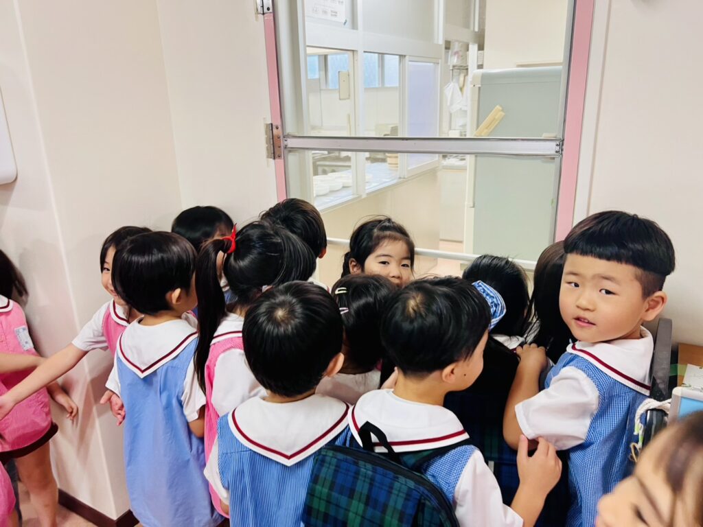 その頃、ちょうど給食室から良い匂いがしていたので、年長さんと行ってみました!!