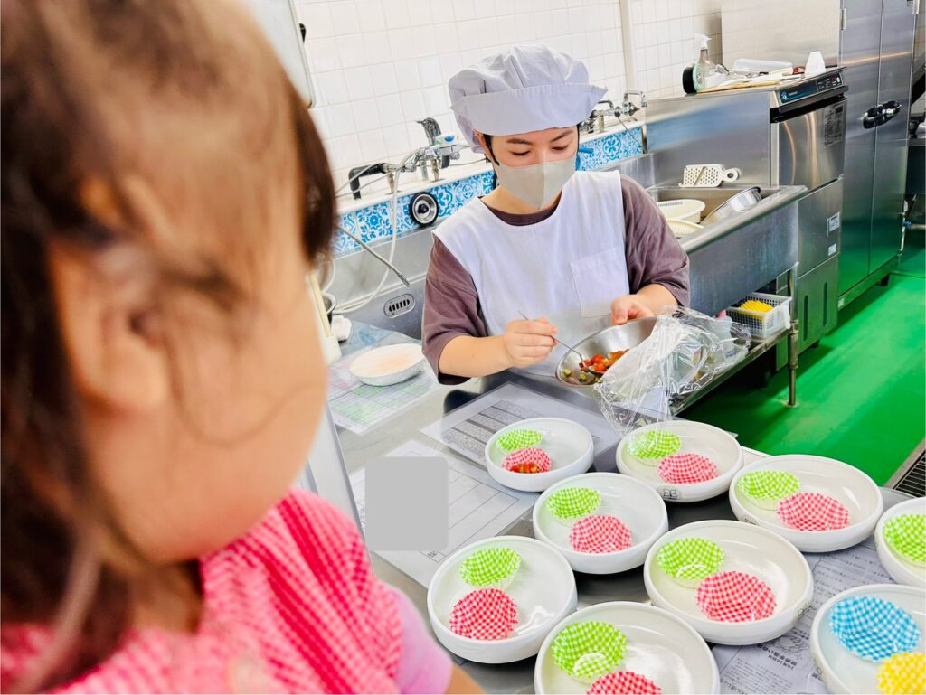 保護者の方にご準備いただいた〝自分のお弁当箱〟に詰めていきます!!