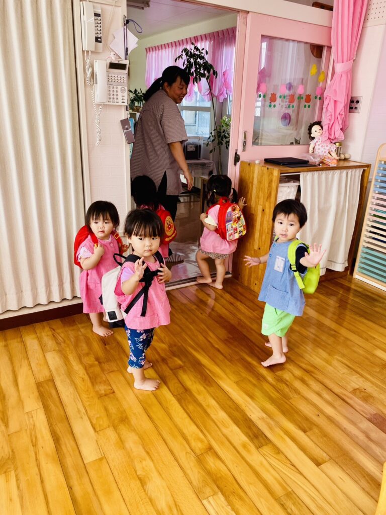 出来たお弁当はカバンに入れて、元気な声で「いってきまーす!!」と、少し園内をピクニックしました。