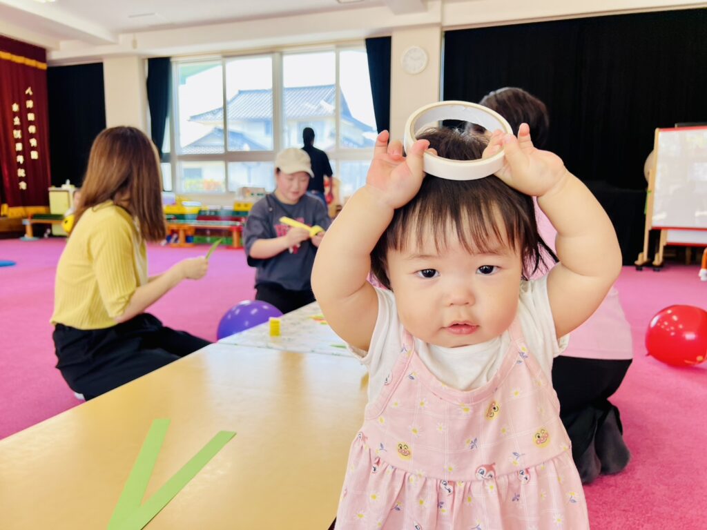 両面テープにも興味があったようで、頭や顔につけては笑顔が溢れていました。