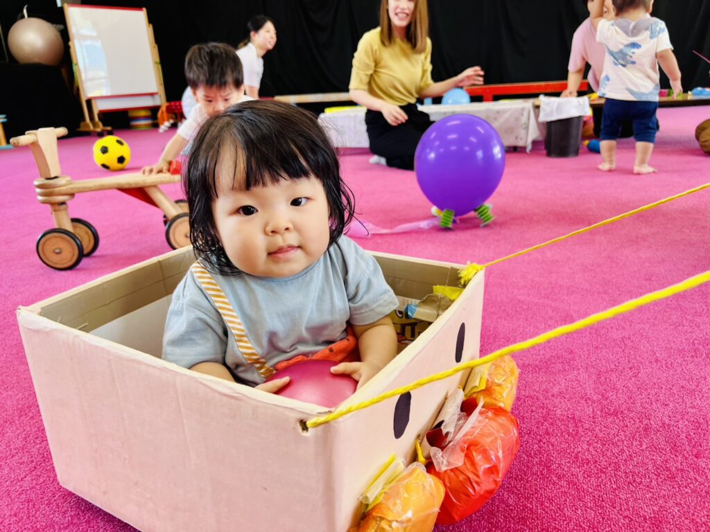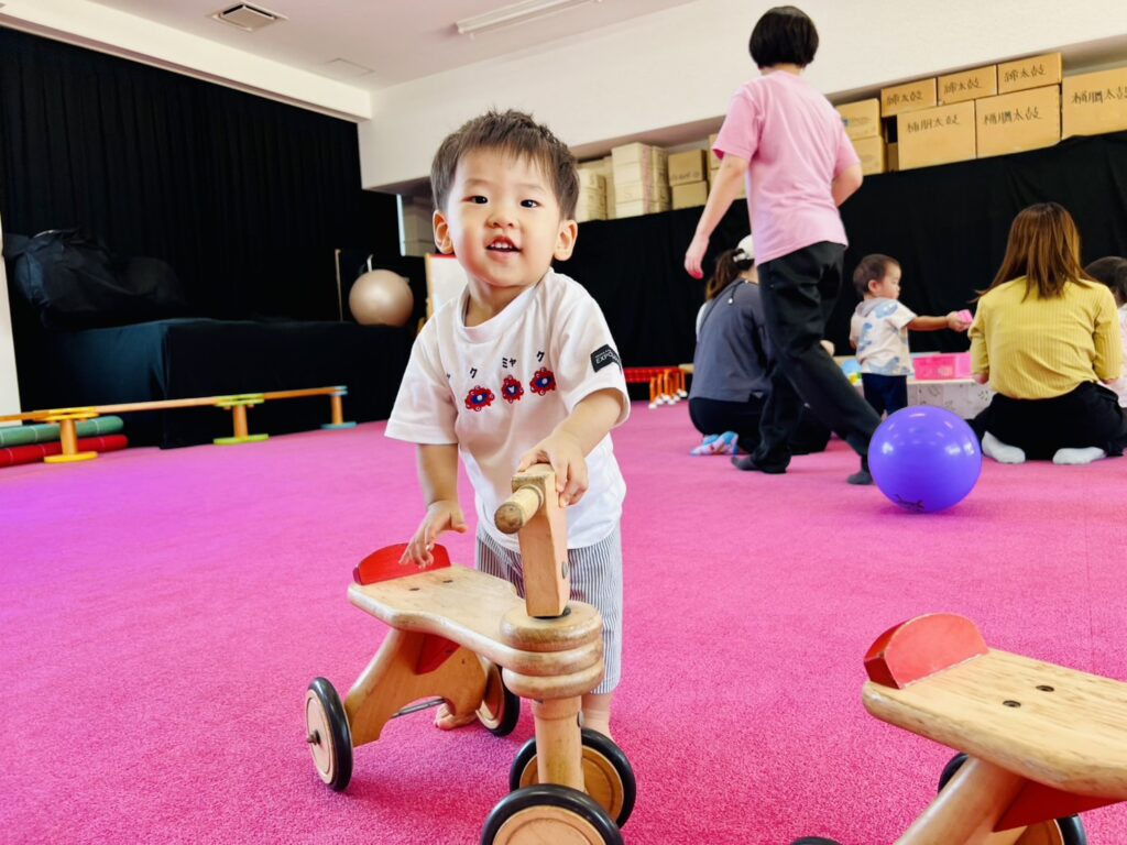 お友だちはお母さんが〝とことこ風船〟の工作中に、広い遊戯室を四輪車やアンパンマン号でダイナミックに楽しみました。