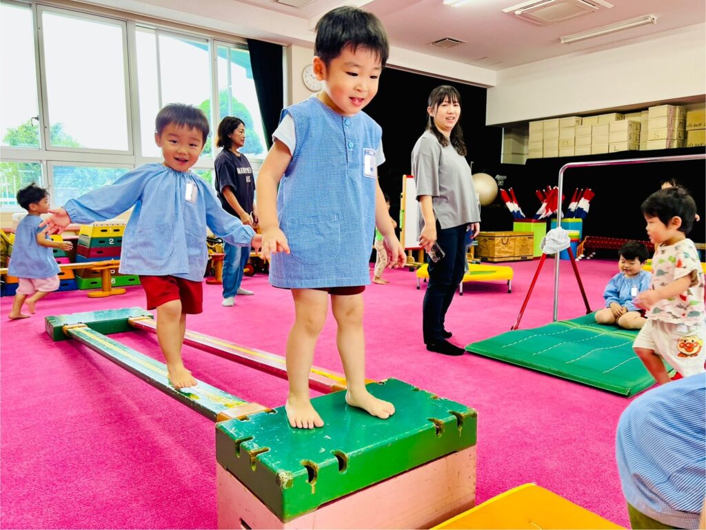 遊戯室から年少児と2才児クラスが縦割り保育で〝運動あそび〟を楽しむ声が響いていました。