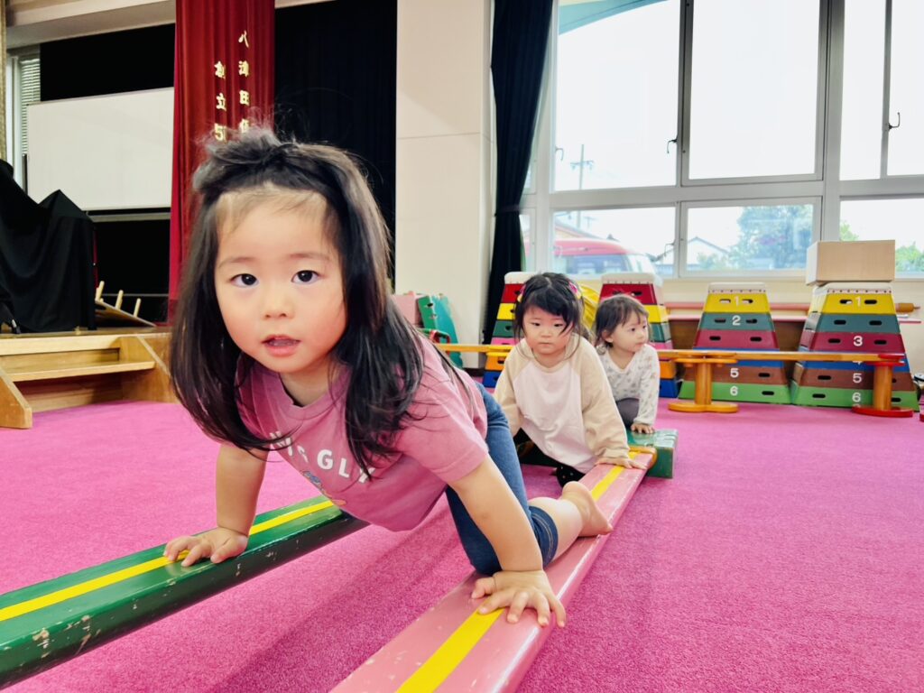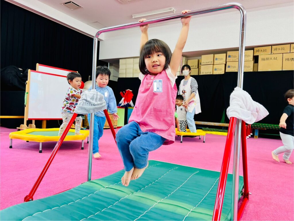 鉄棒にぶら下がり、足上げを披露してくれたのは2才児のお友だちです!!しっかりと掴む力や身体を支える体幹が育っています。