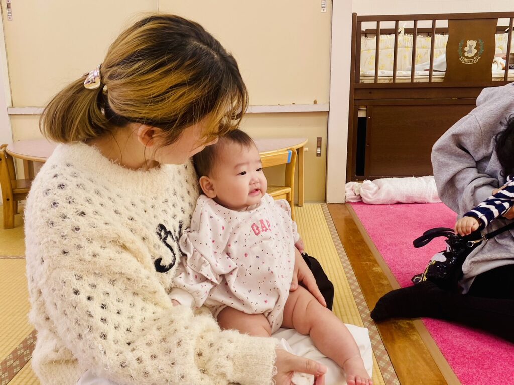 始めは緊張しているようでしたが、だんだんと雰囲気やお友だちにも慣れてきたようで、今回は〝わらべうた〟で楽しみました。