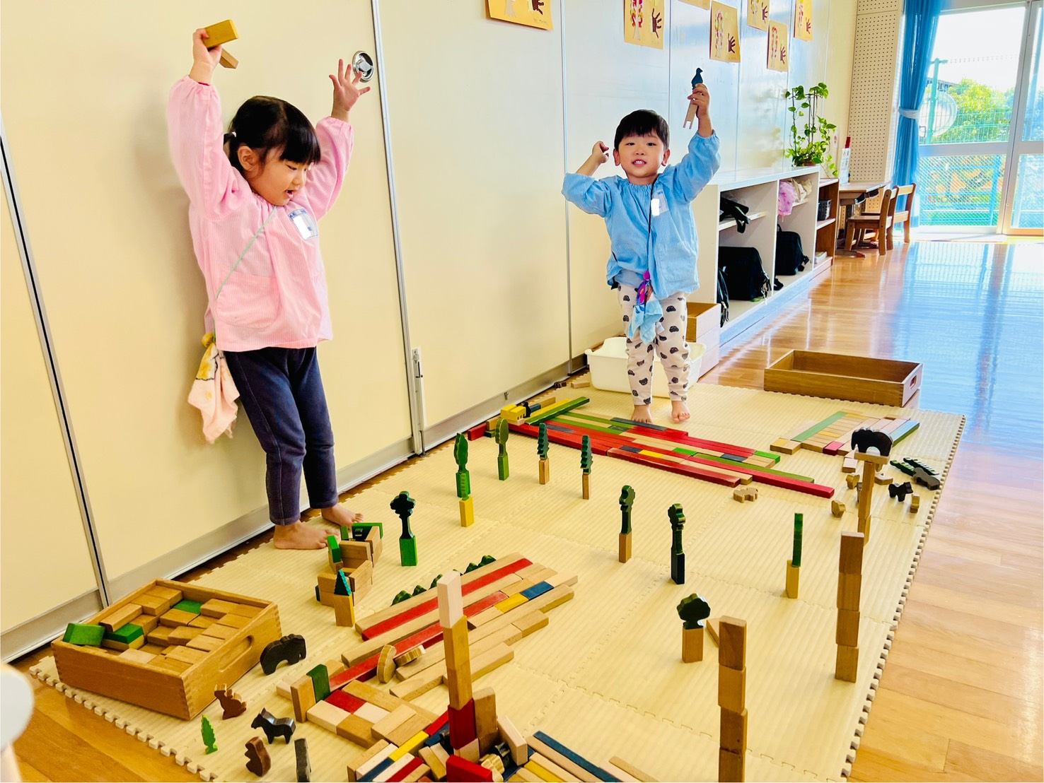 年少児クラスでは、遊びのなかで積み木を使って〝こどもまつり〟表現していました。