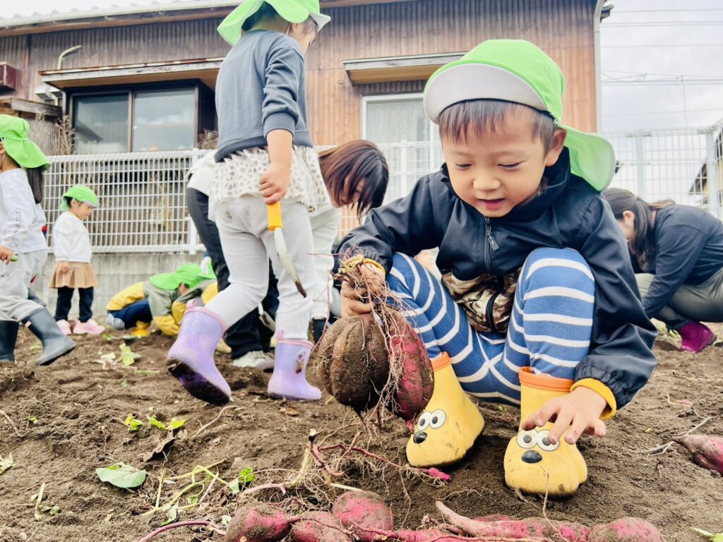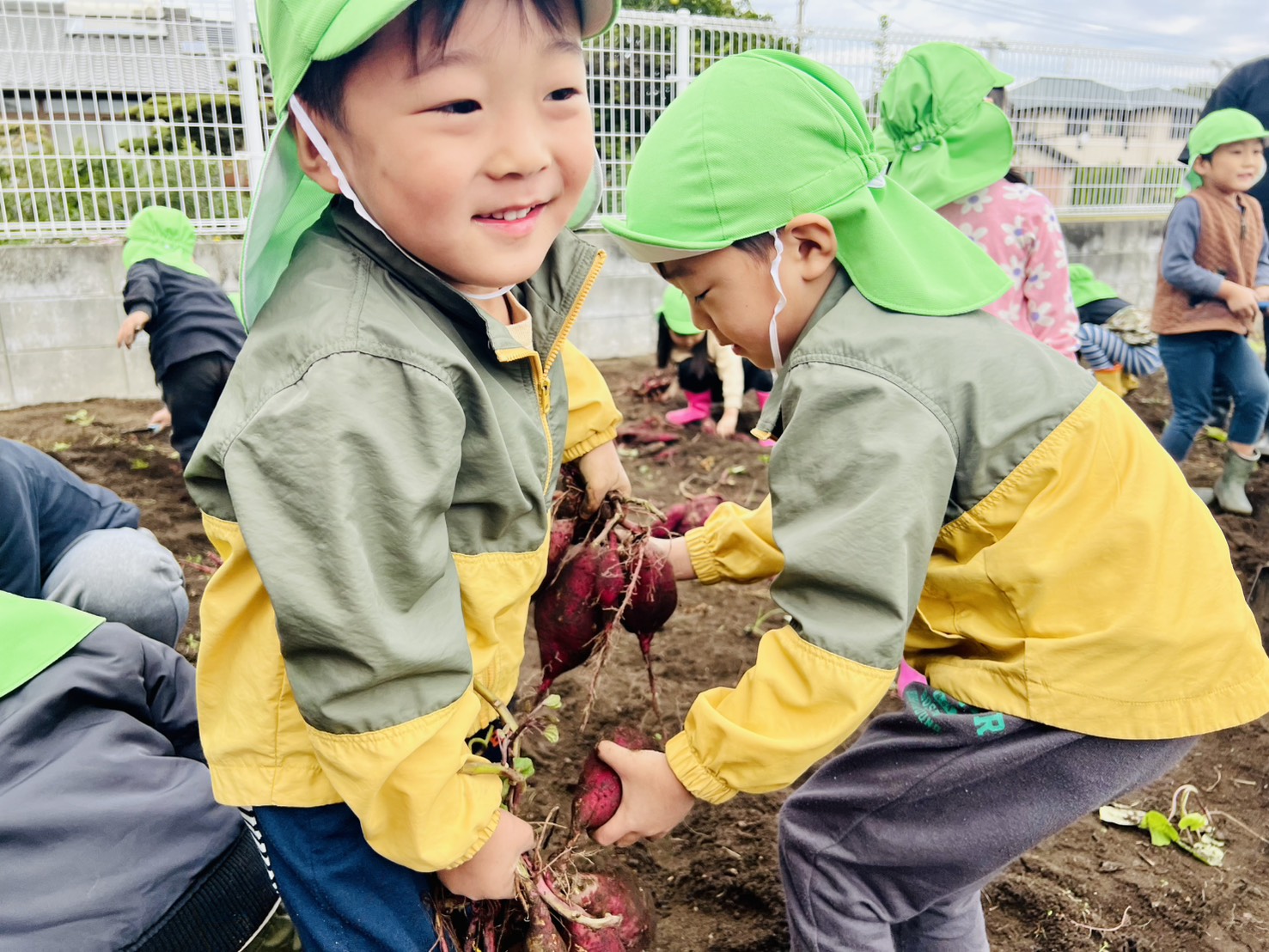 そして、心温まる姿も見られました。なかなか掘り出せないお友だちに気がついては、協力して掘り出している姿や見学に来ていた未満児さんに掘れたての芋を紹介している姿もみられ、お芋以上に大きな成長も感じました。