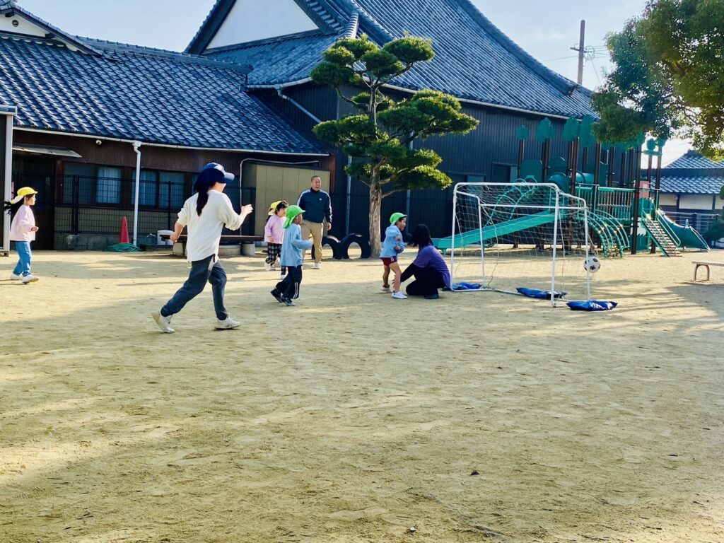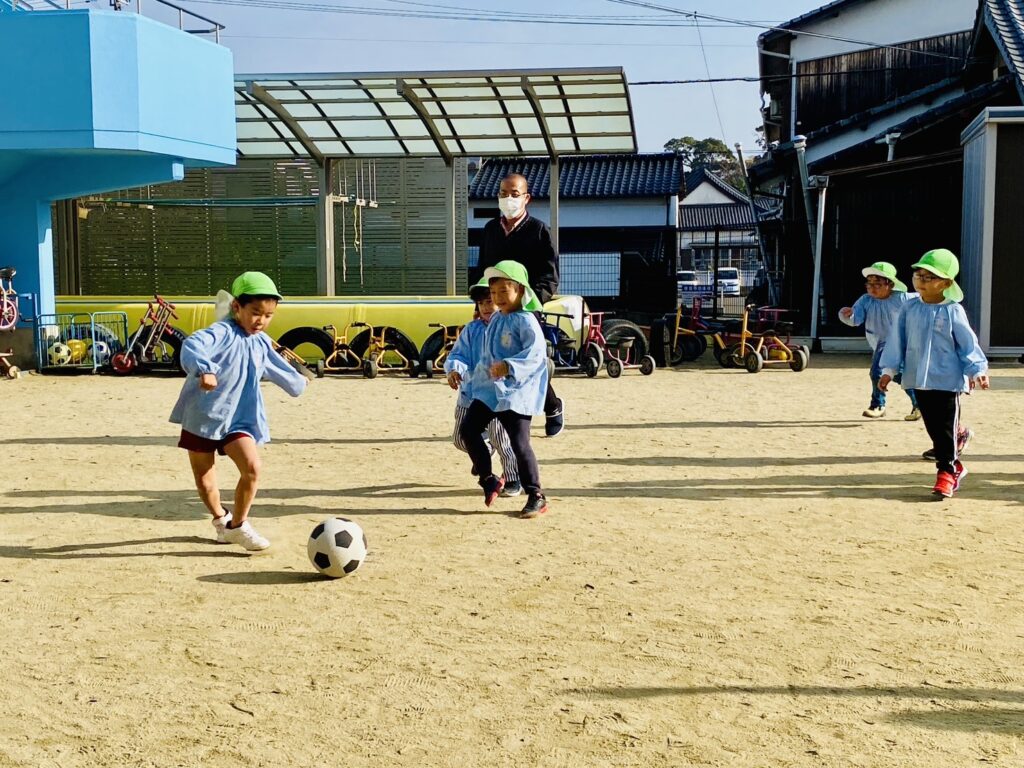 昨日は、朝から年長児と年中児とでサッカーの試合をしていました。