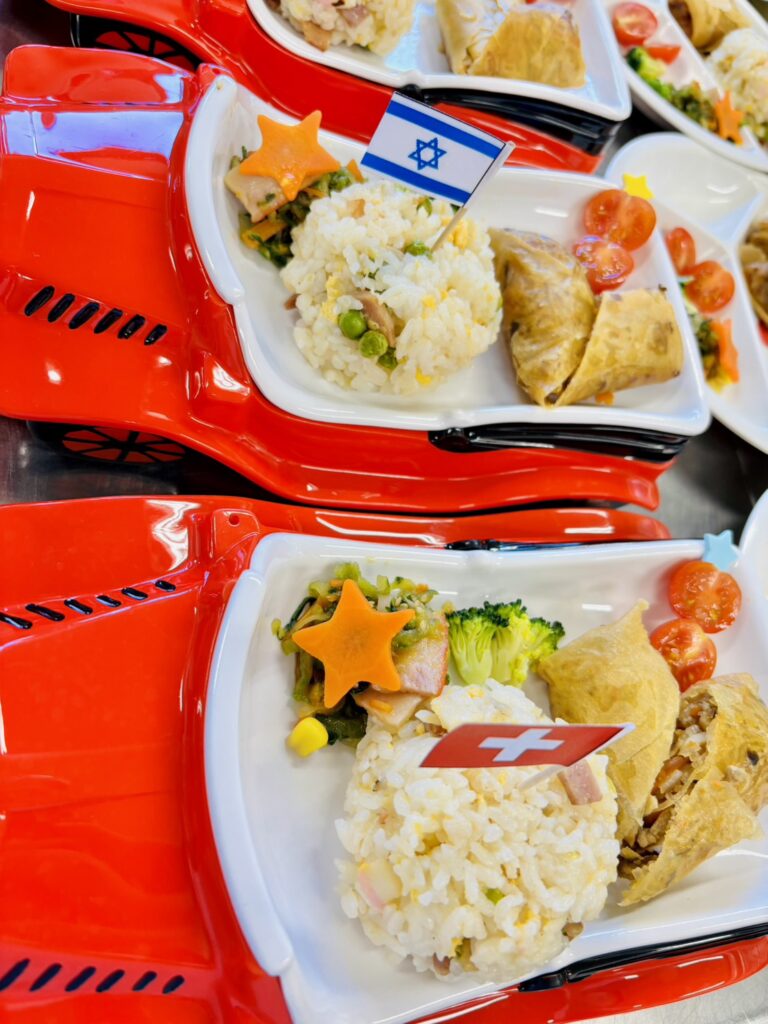お遊戯室で楽しんでいる頃、給食室では誕生会の特別メニューも盛り付けられていました。