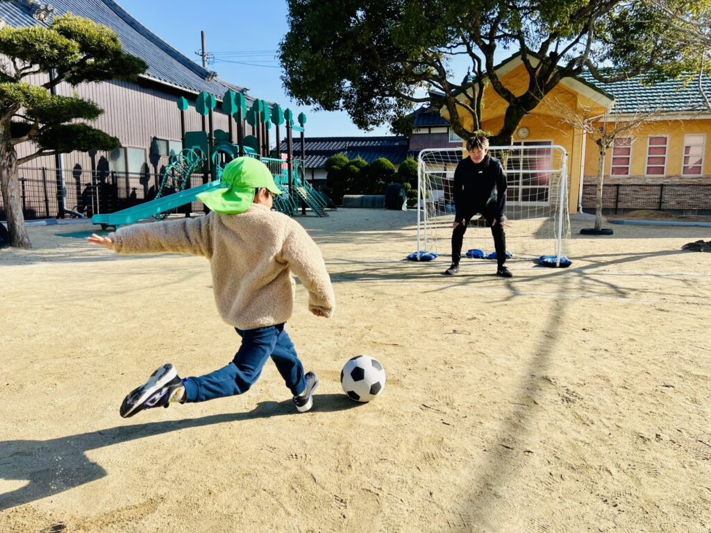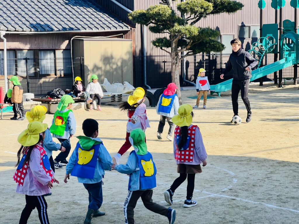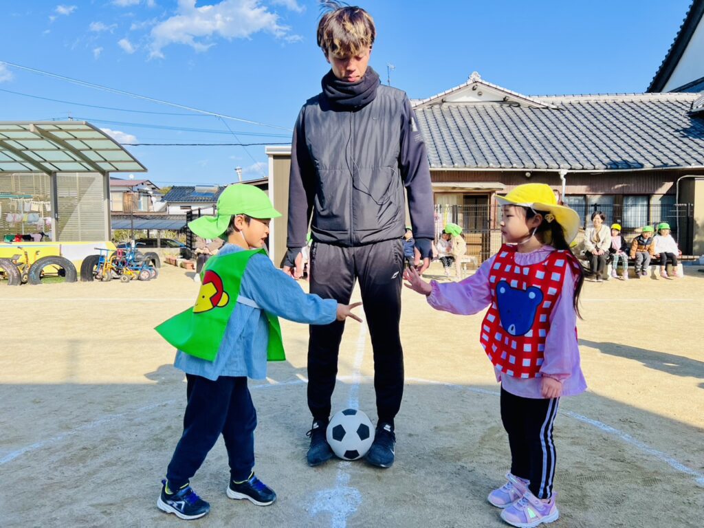 年長児(5歳児)対年中児(4歳児)との試合を行いました。松山選手はいつの間にか年長児のチームとして参加していました!