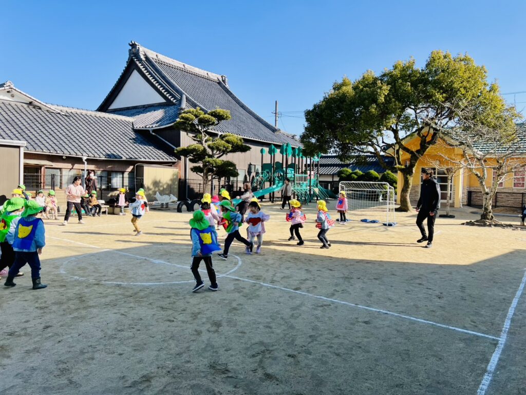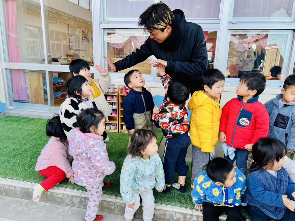 子ども達も私たちも、松山選手に会えることをワクワクしながら待っていて、かわいい声が届いた頃、園庭に登場してくださいました。