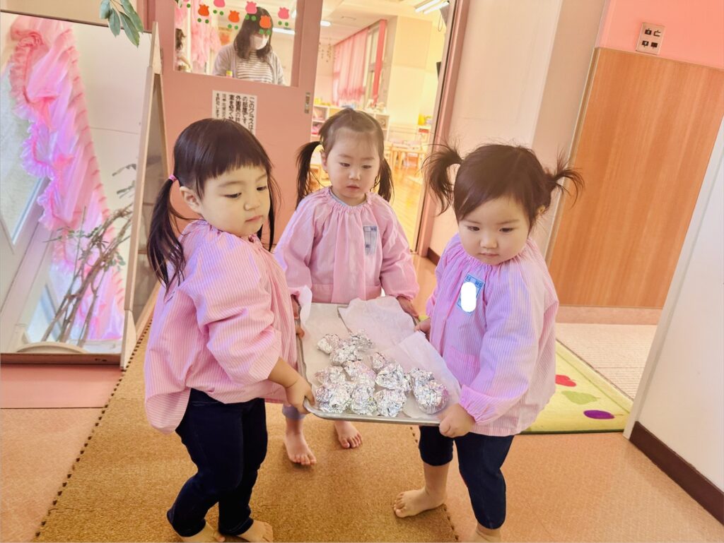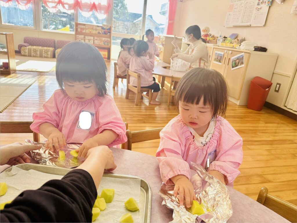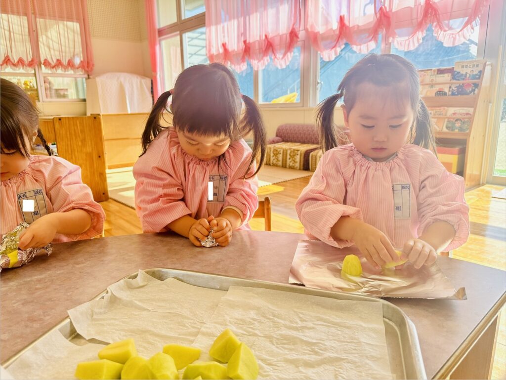 当園の〝いのちの畑で収穫したジャガイモ〟を自分の手で包み、お友だちと作る楽しみや食べる楽しみを感じることを目的に活動していました。