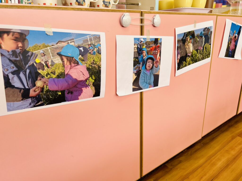 また今日の保育室は、ジャガイモの収穫体験が思い出しやすいようにと、たくさんの写真がスライドショーのように壁面に掲示されていて、子どもを願うあたたかな先生の気持ちが写真から溢れていました。