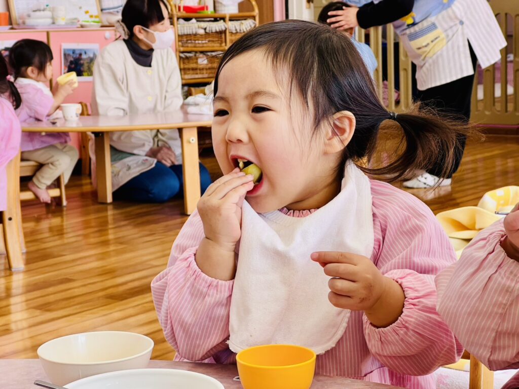 今日の1歳児0歳児クラスでは、食育活動を行っていました。