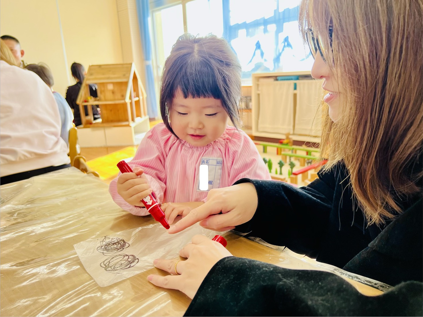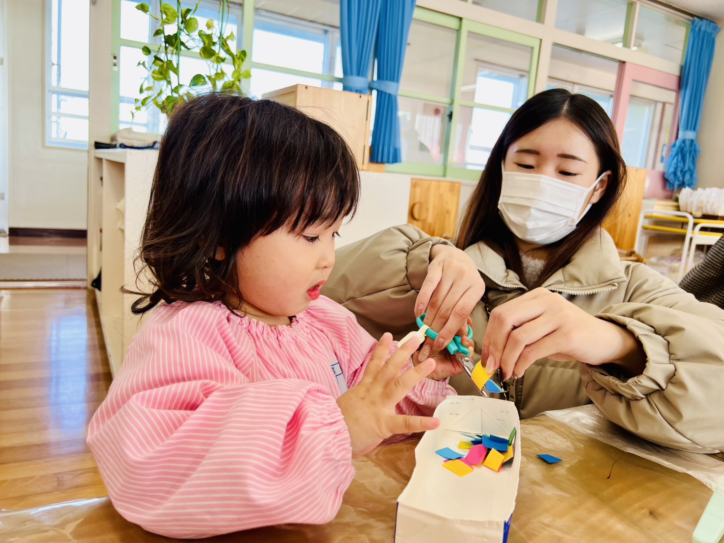 2歳児クラスでは、お子さまとご一緒に工作の活動です。