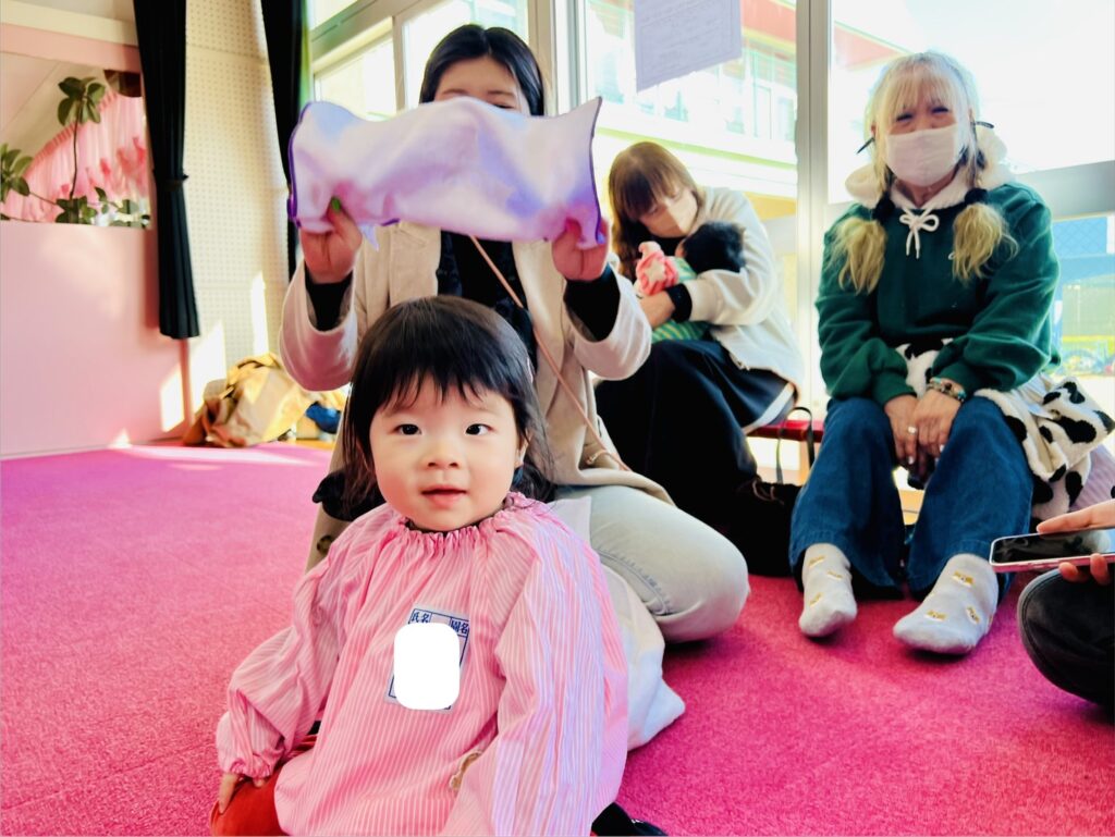0歳児・1歳児クラスは、ビデオ鑑賞から始まりタオルを使っての触れ合い遊びの活動を行いました。