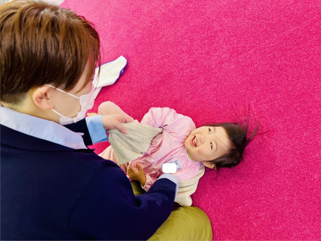 続いて全体での〝おさかなゲーム〟は、子どもがお魚役になり、保護者の方が逃がさないように身体全身を使っての活動です。