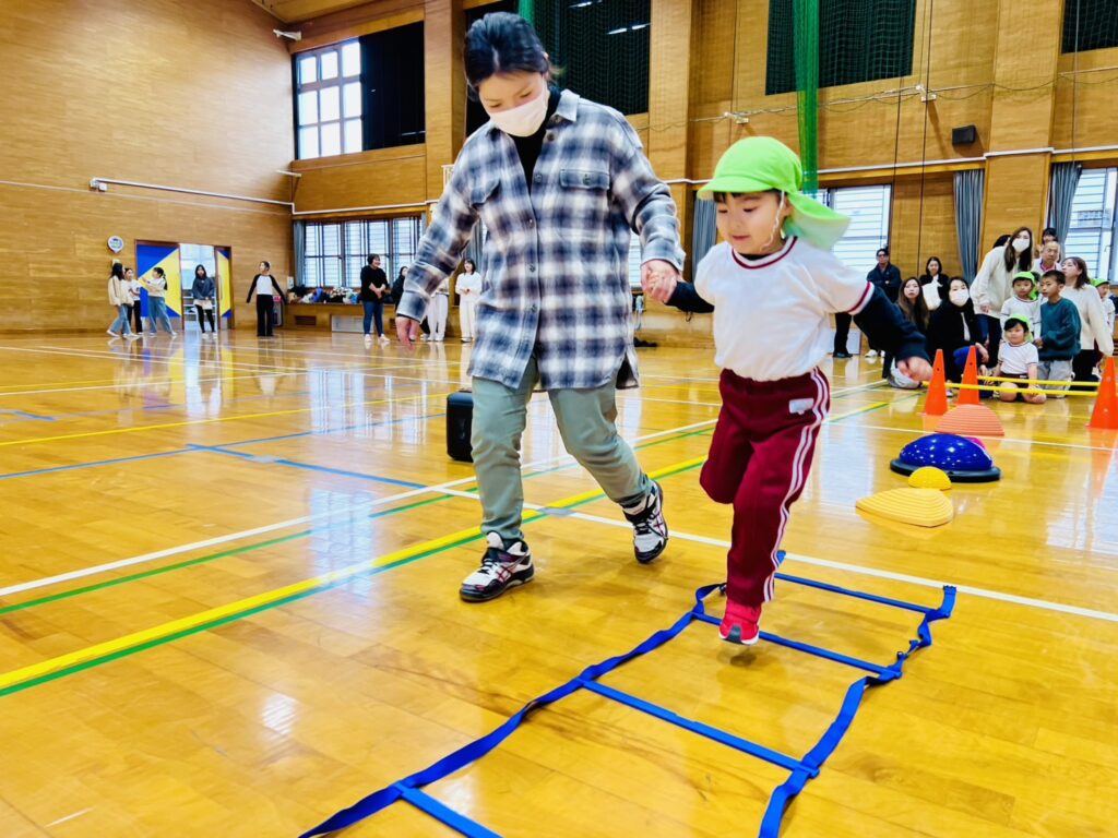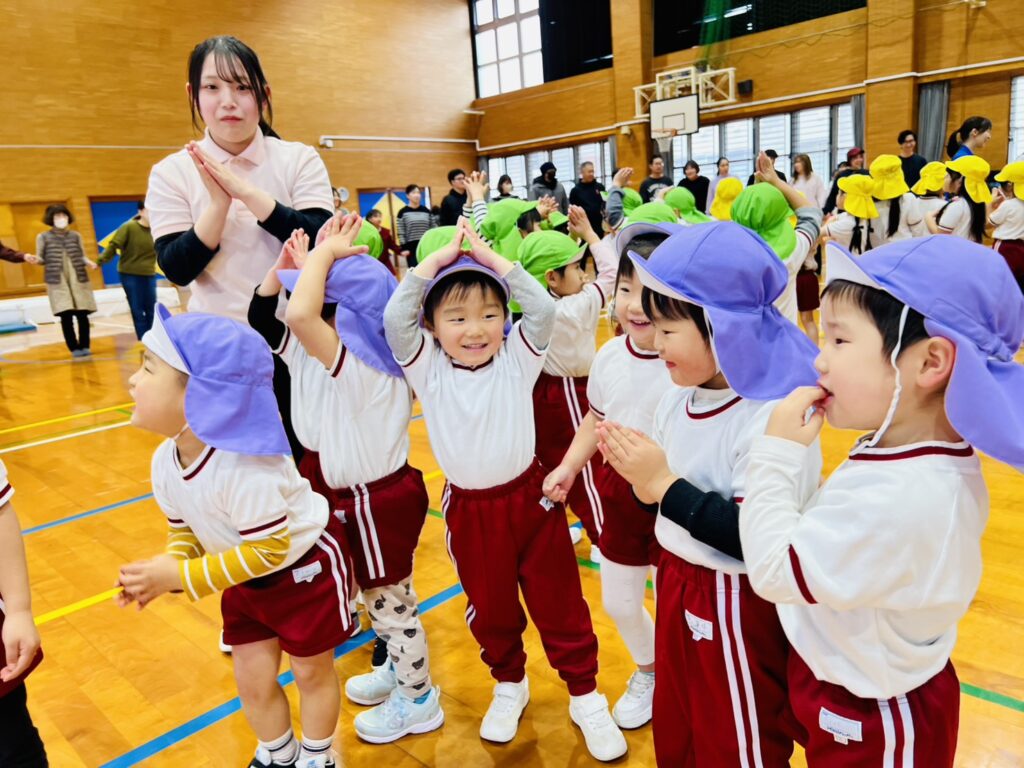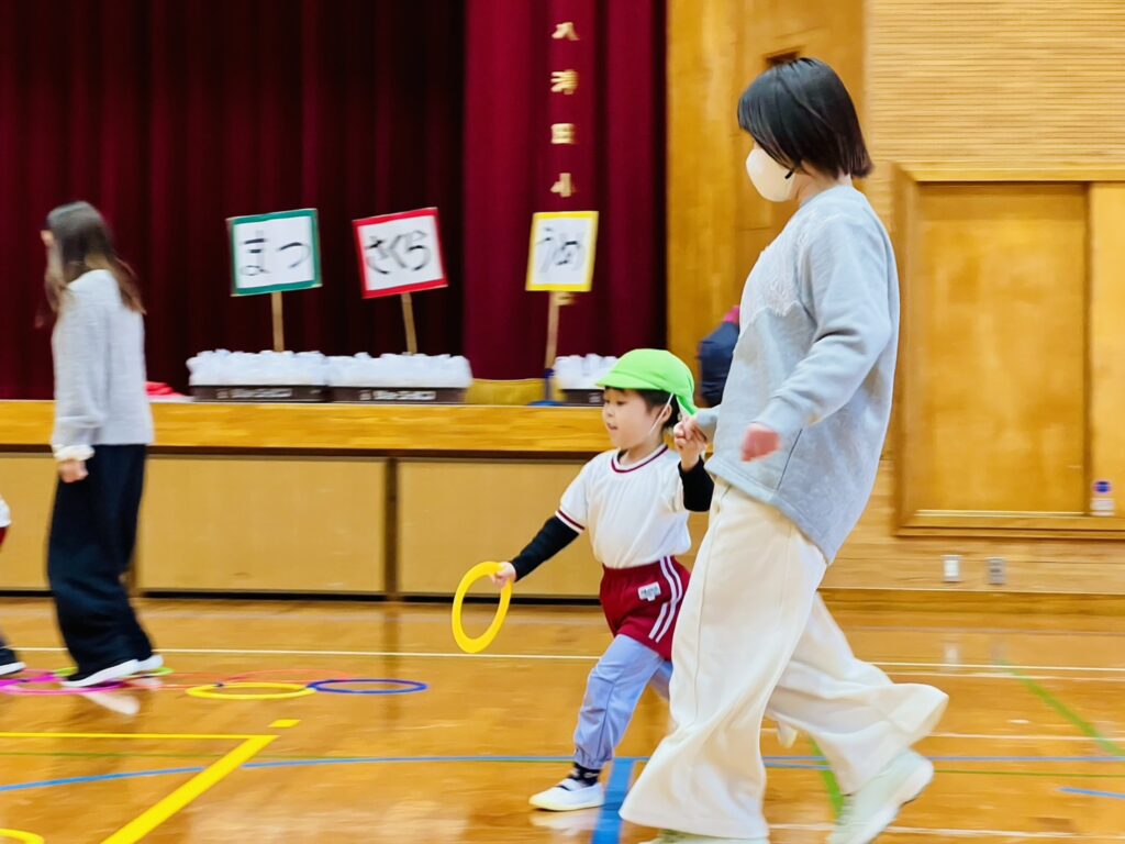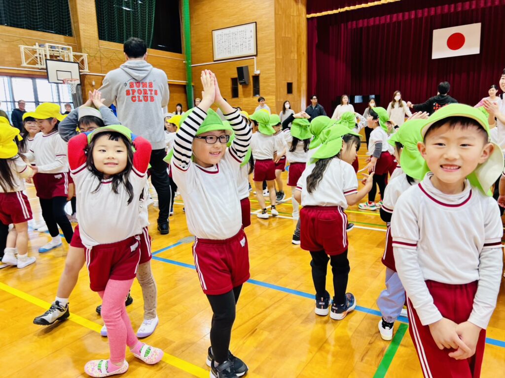 以上児クラスの保育参観は、八津田小学校の体育館に場所を移動して行いました。