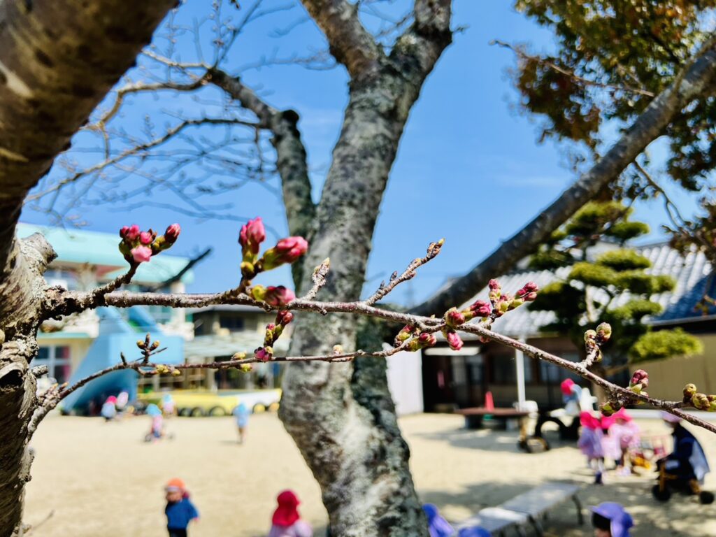 園庭の桜もまだまだ満開とはいきませんが、蕾みも春の陽気にほぐされているようです。