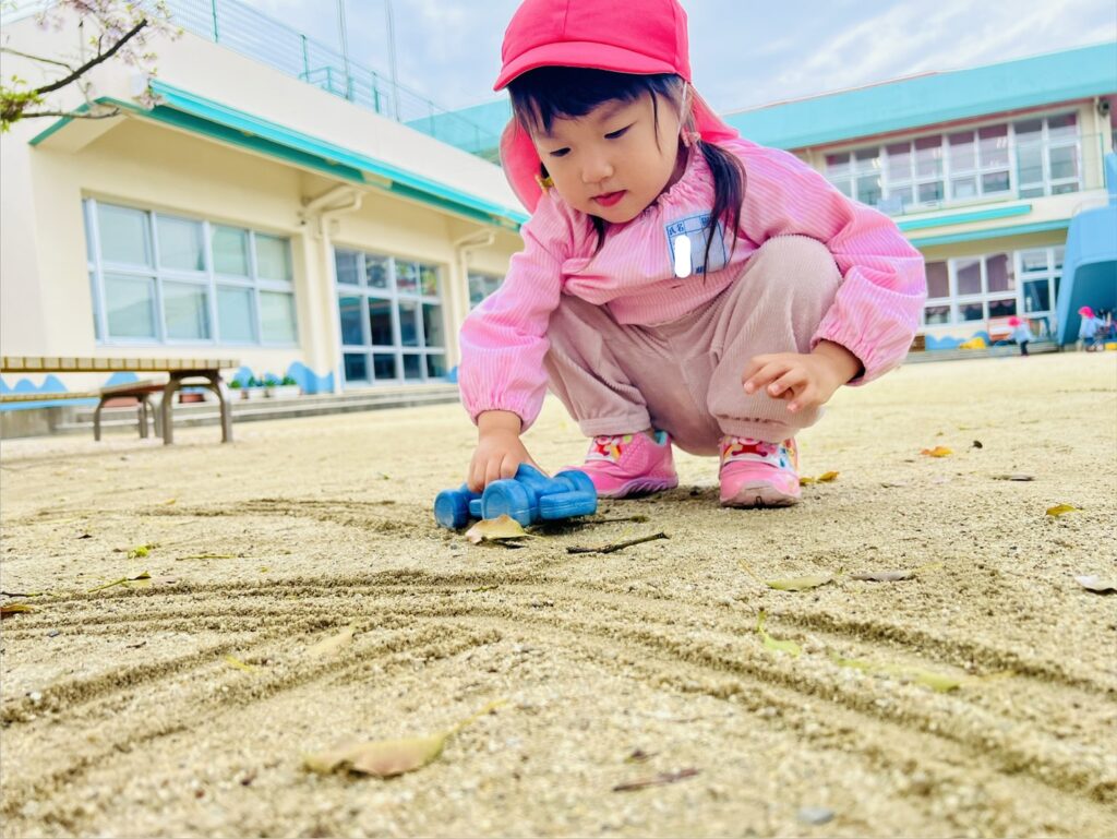 園庭でしゃがみ込む姿の先は〝遊びを通してたくさんの学びを吸収している姿〟です。