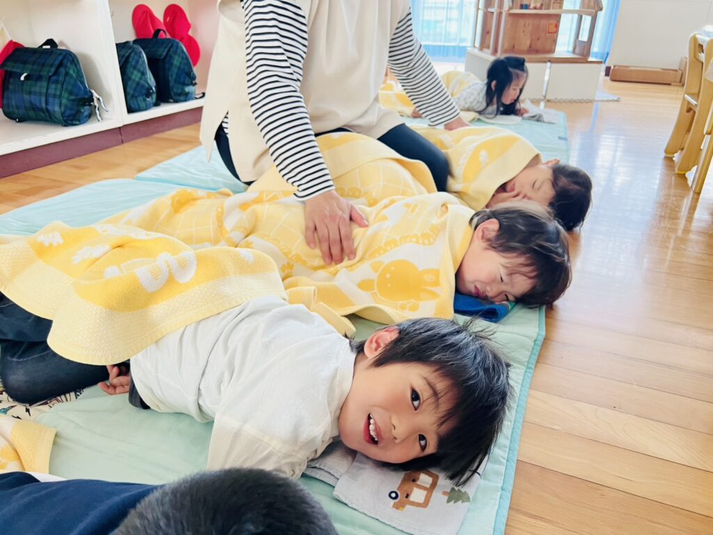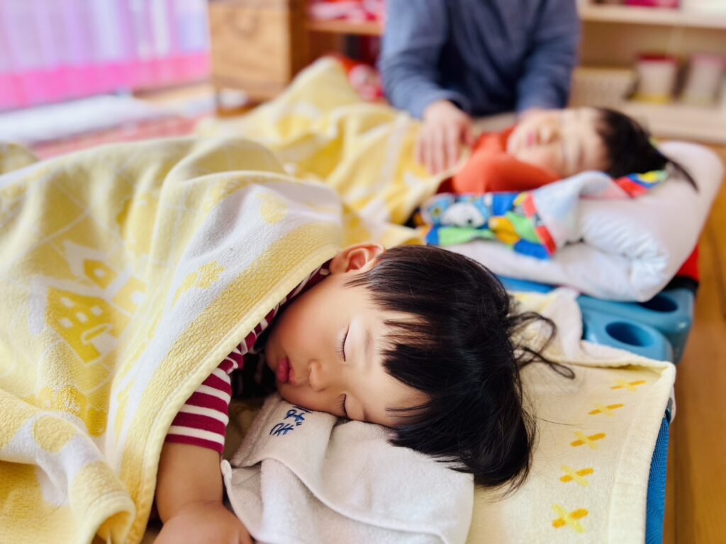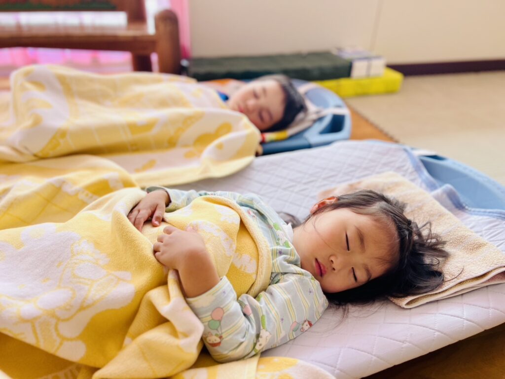 当園では、年少までの園児には〝お昼寝(午睡)〟を行っています。