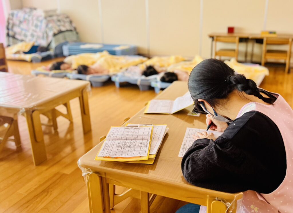 また、子どもが眠ると〝ご家庭との連携とお昼寝チェックの時間〟です。