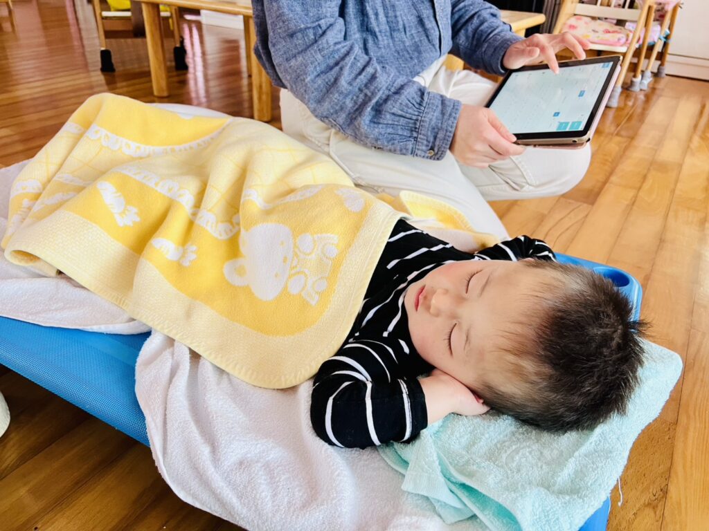 お昼寝チェックでは、アプリを活用し5分おきに呼吸や体の向き、顔色などを確認し、SIDS(乳幼児突然死症候群)や窒息事故を防ぐために行っています。