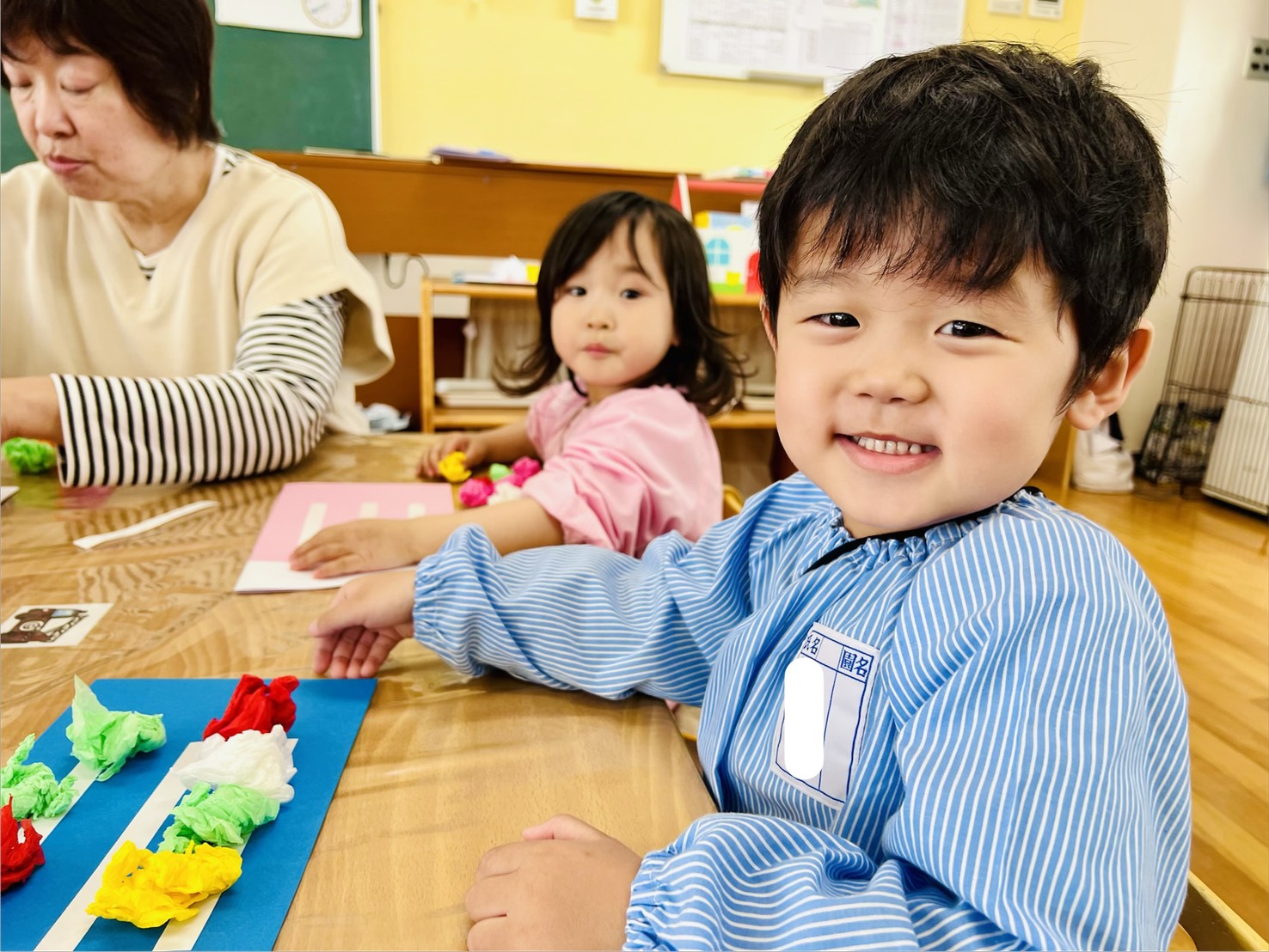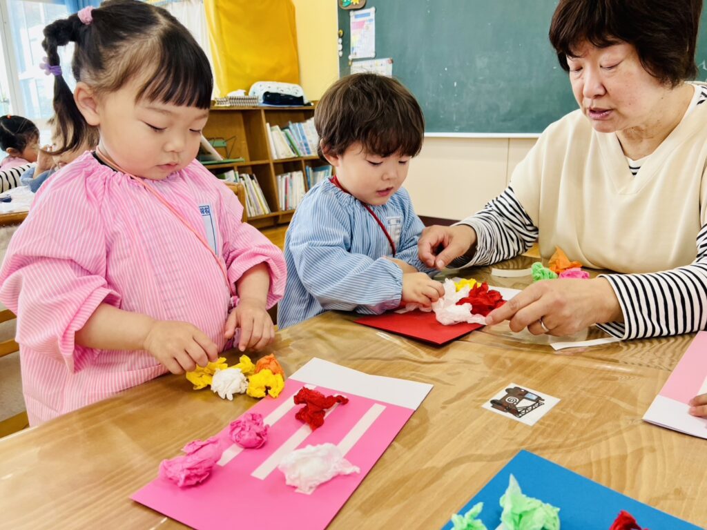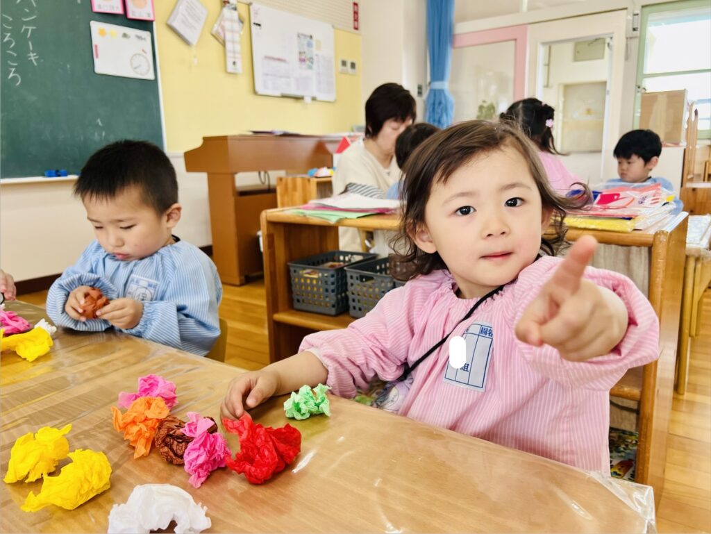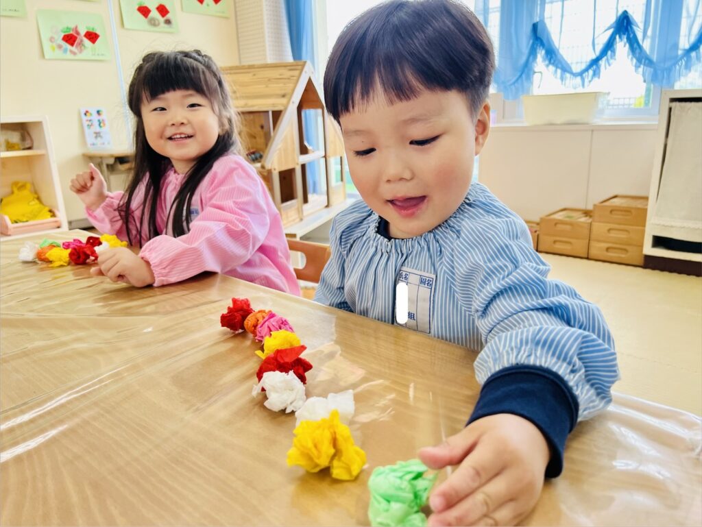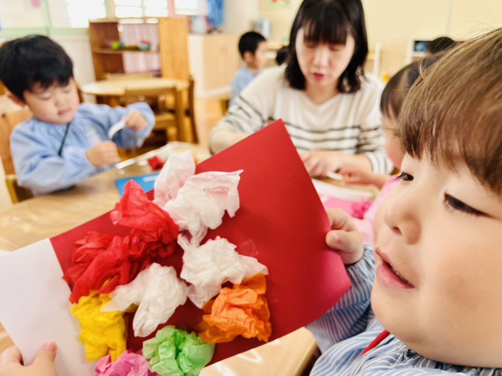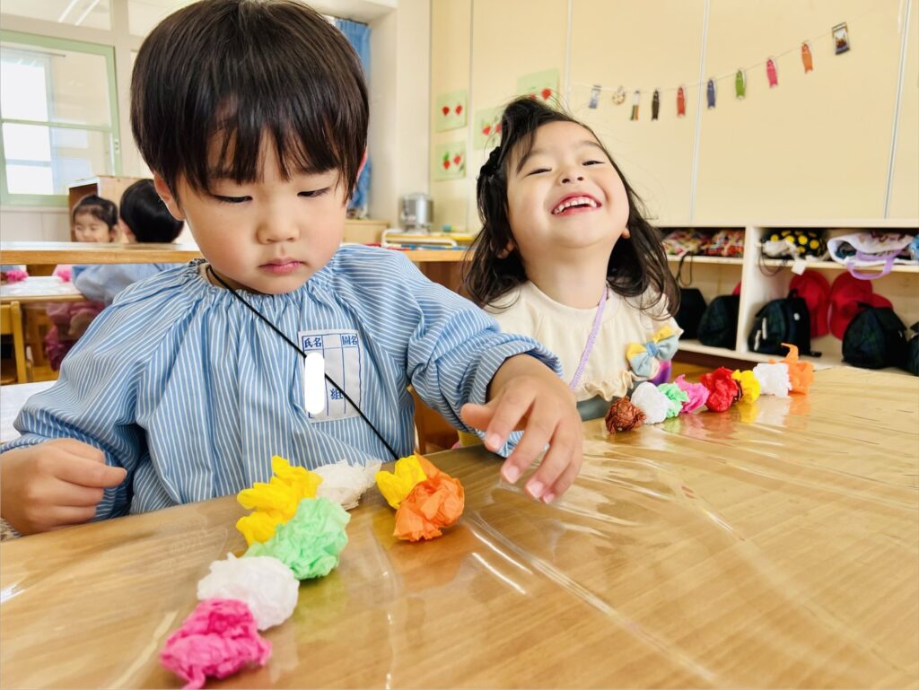 年少クラスでは、花紙を鯉のぼりのウロコに見立てての活動中でした。