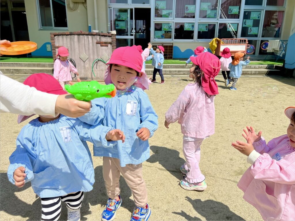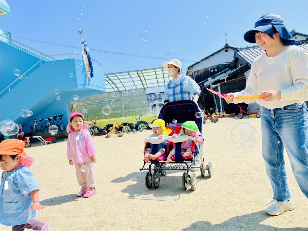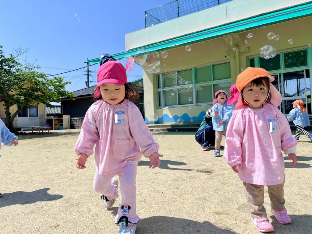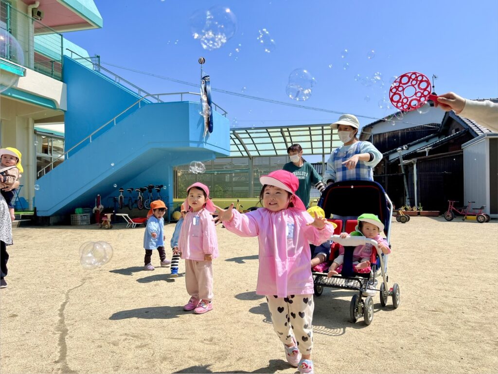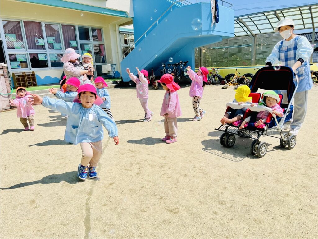 複数の先生が園庭いっぱいにシャボン玉を飛ばし、風に乗っては空高く上がったり、地面に落ちたりと、遊びを通して風の動きを感じていました。