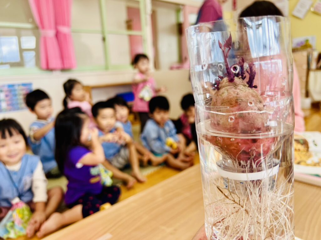 園舎の内外は子ども達に〝季節の移ろい〟や〝自然の不思議〟を感じて欲しい願いから、お花や観葉植物など多く取り入れています。2才児クラスでは、保育者が季節の変化を見える形で保育室の環境構成をしていました。「たねをたべた けもの」という絵本から...