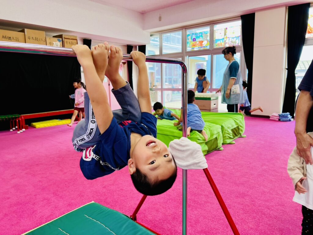 遊戯室から年少児と2才児クラスが縦割り保育で〝運動あそび〟を楽しむ声が響いていました。鉄棒にぶら下がり、足上げを披露してくれたのは2才児のお友だちです!!しっかりと掴む力や身体を支える体幹が育っています。年少児さんは〝大型クッションマット〟... -
