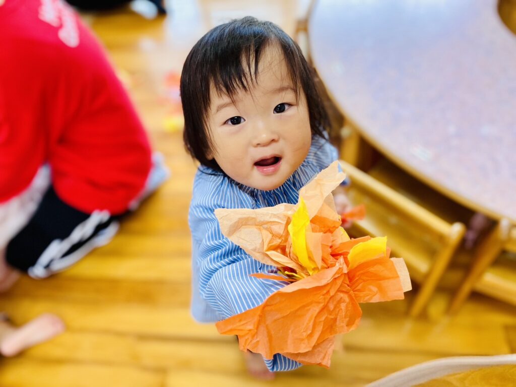 未満児クラスからの楽しそうな声に誘われてお部屋に入ってみると、〝この楽しさを伝えたい〟と言わんばかりに手渡してくれ、お部屋一面が〝落ち葉のジュータン〟でした!!ダインミックな落ち葉遊びの経験をと、落ち葉色に見立てた〝はな紙〟が舞っていまし... -