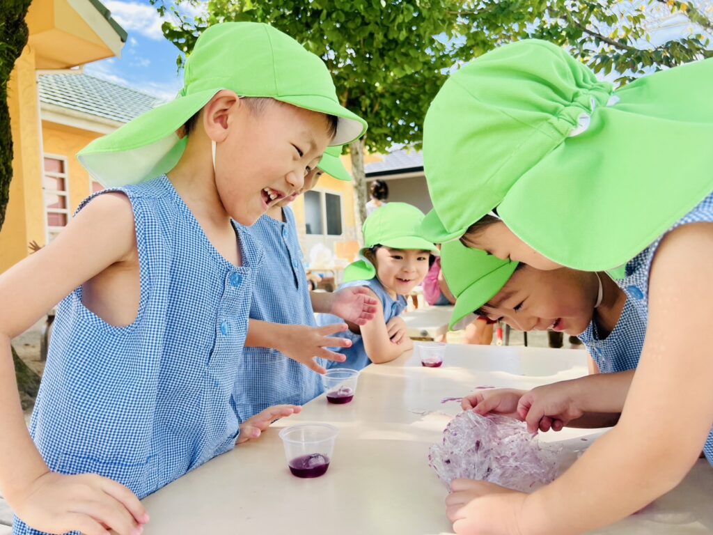 前日の誕生会で〝光の色彩〟に出会った子ども達、今日は〝色みず遊び〟で〝水の色彩変化〟を楽しみました。まずは、先生が〝色みず〟って、とお話しがあり、あっという間に変化する色みずに、驚きと不思議な眼差しで見とれていました。 ひとり一人に準備さ... -